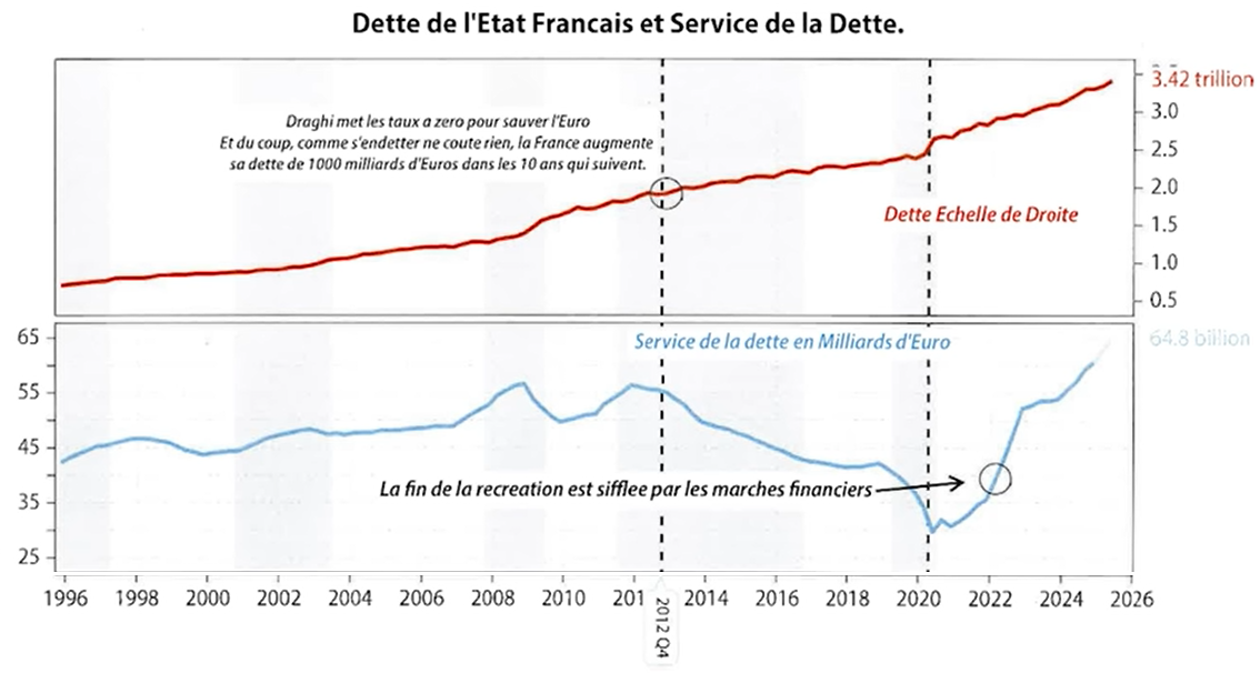 Ces intérêts annuels sont déjà colossaux : en 2025 = de 58 à 65 milliards d’euros.