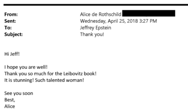 Peut-on croire une seule seconde -en fonction du contexte, de l’histoire- qu’Epstein perdait des HEURES à discuter avec Alice de Rothschild parce qu’il s’intéressait sincèrement à ses études aux Etats-Unis et à sa réussite universitaire ?