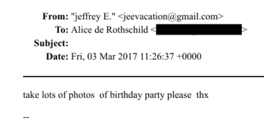 Février 2018. Alice de Rothschild est donc étudiante à l’Université de New York. On le sait, car l’assistante de la baronne envoie l’adresse postale d’Alice à l’assistante d’Epstein… Car tonton Jeff a encore un paquet à envoyer à Alice.