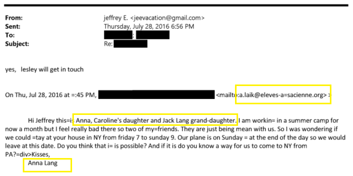 Le 24 juin 2013 (Anna Lang a alors 14 ans) quelqu’un (adresse e-mail caviardée) envoie 5 photos (fichiers JPEG) à Epstein.