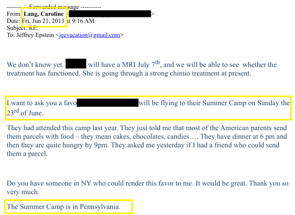 Enfin, le coup de grâce, toujours en 2013, un message envoyé par Caroline Lang à Epstein… prouve qu’elle parle déjà de ses filles qui vont dans le fameux camp d’été en Pennsylvanie…